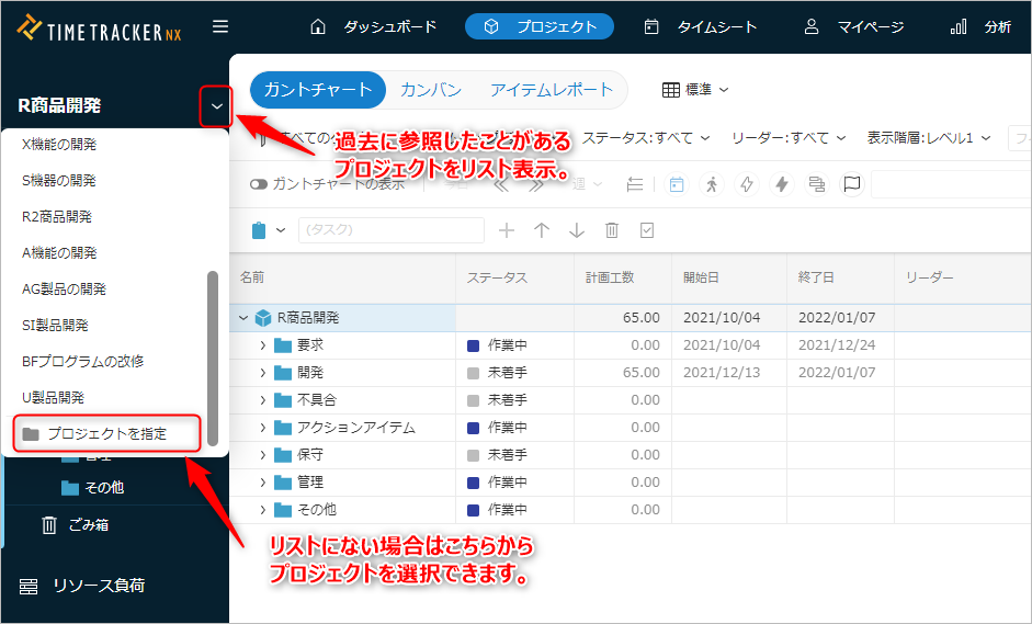 | 2 | プロジェクトへのパス | 対象のワークアイテムがガントテーブル上で選択された状態でプロジェクトを開く |