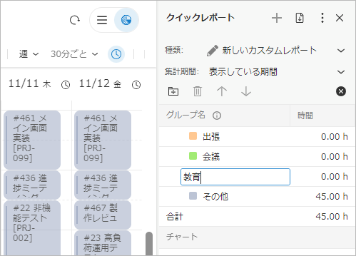 名前が編集可能な状態で[グループ名]の箇所に追加されるので、グループがどのような工数を集計したか分かるような名前(例えば「出張」など)を入力する。