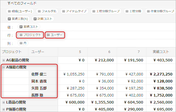 - 行や列にプロジェクトやアカウント、年・月などを集計軸として自在に行や列に設定する。