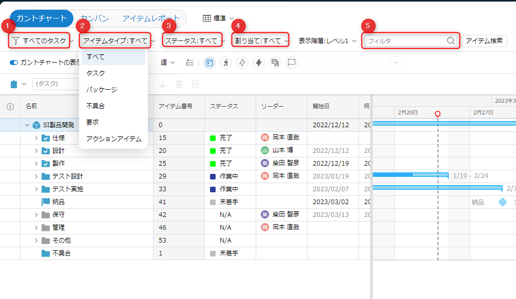 - ガントチャートの詳細は、「ガントチャートを編集する」を参照ください。