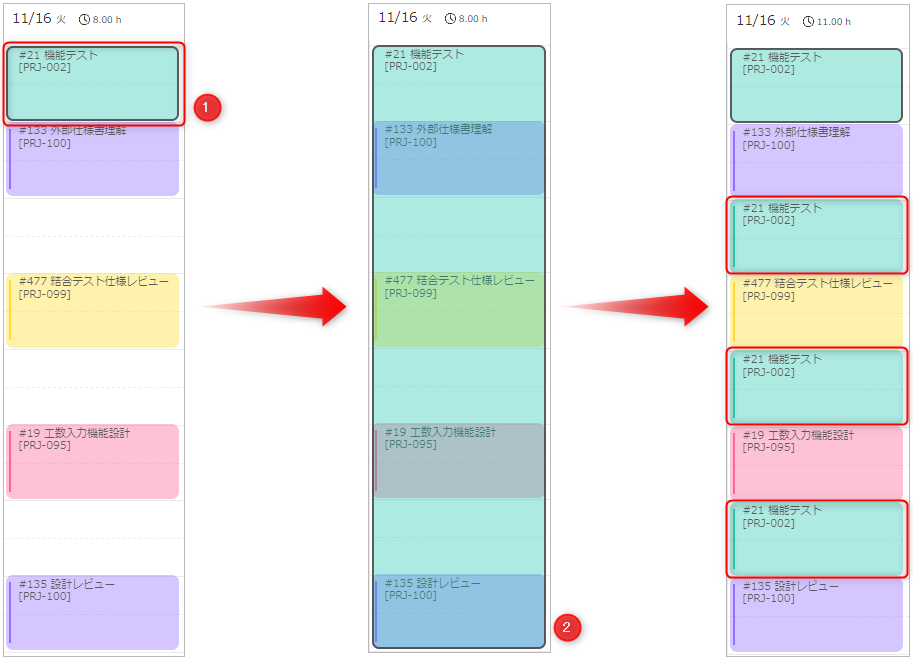 - 実績工数を移動する :対象とする実績工数を選択し、移動先の時間帯にドラッグ&ドロップする。